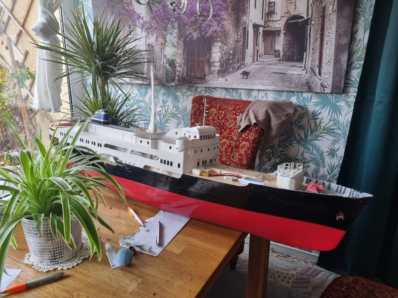 das vergangene Jahr war kein gutes Jahr für mich. Leider haben mehrere Schicksalsschläge und Entwicklungen im privaten Bereich dazu geführt, dass ich mich für Monate mit anderen Dingen beschäftigen musste. Mittlerweile ist dies nun aber weitgehend überstanden und ich werde nun diese Webseite an der Fertigstellung meines aktuellen Projektes "MS Finnmarken" teilhaben lassen. Da der VTH-Verlag Interesse gezeigt hat, einen Baubericht in der Zeitschrift "ModellWerft" zu veröffentlichen, was für April oder Mai 2025 anvisiert ist, habe ich nun mit dem weiteren Ausbau begonnen. Derzeit ruht das Schiff auf meinem Wohnzimmertische und sieht, nicht ganz stilgerecht zwischen tropischen Zimmerpflanzen, der Fertigstellung entgegen (siehe Foto).