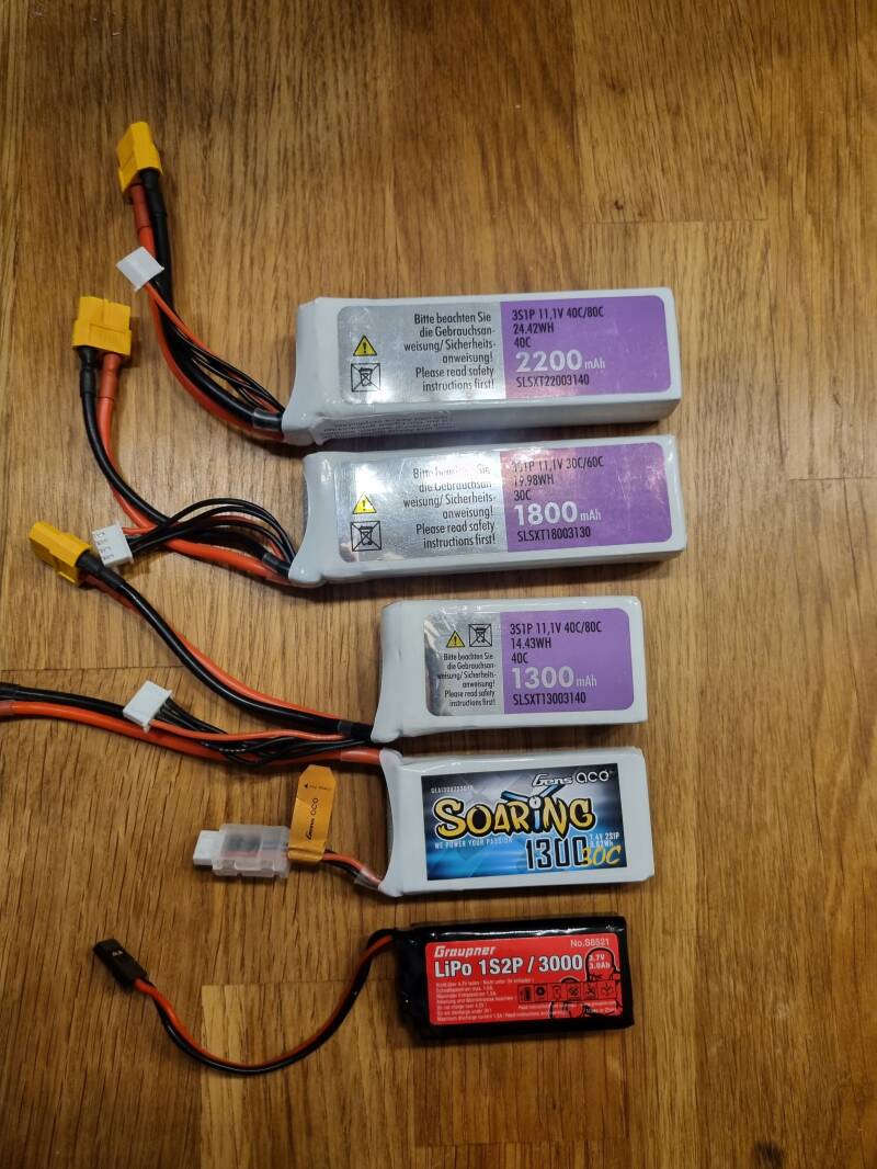 Der 2. Lipo von unten trägt den Aufdruck 7,4 Volt 2S1P 1300 30C.