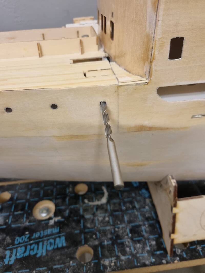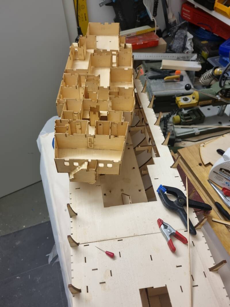 Nachdem die Decks der untersten Ebene nunmehr ihre Beleuchtung erhalten haben, wird nun der Rumpf komplett beplankt!