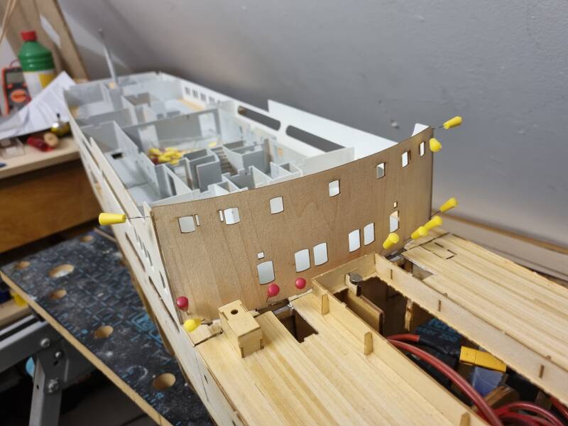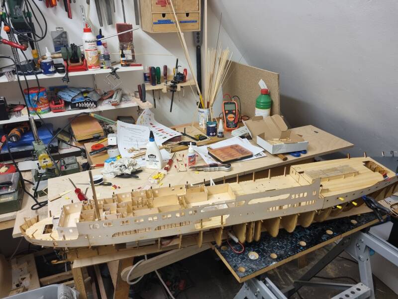 Dieses (vordere) Unterdeck wird als nächstes mit Beleuchtung versehen (rechtes Foto oben). Bevor dann die übrigen Decks dran sind, habe ich beschlossen, den Rumpf zu schließen, indem die komplette Beplankung erfolgt. Dies ist möglich, weil alle Arbeiten im Inneren des Rumpfes erledigt und insbesondere die elektrischen Anschlüsse für die oberen Decks bereits nach oben durchgeschleift sind. Meine Motivation ist hoch und ich werde jetzt zügig weitermachen. Deshalb lohnt es sich, die Seite in nächster Zeit häufiger zu besuchen!
