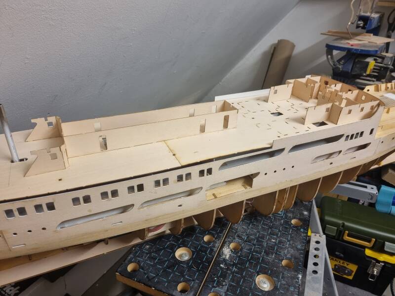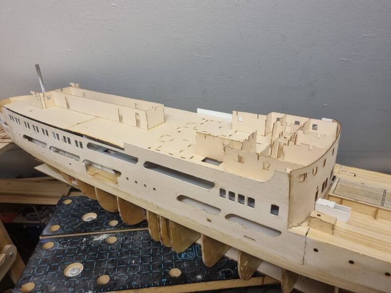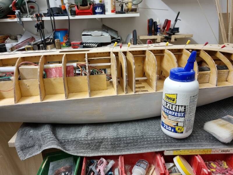 Die Decksbereiche rund um das herausnehmbare Oberdeck wurden beplankt. Das Deck selbst ist mit Primer behandelt und erhält als nächstes seinen endgültigen Anstrich, bevor der Detailausbau erfolgt.