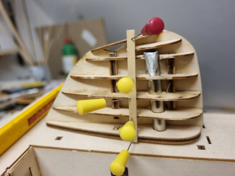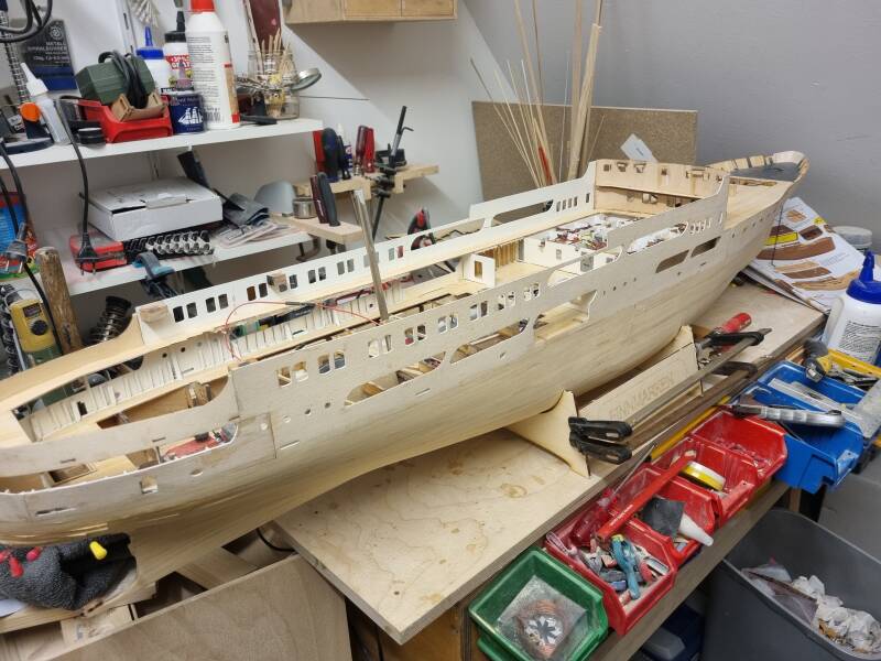 Der Bau der Finnmarken schreitet rasant fort. Die Akkus sind nun sicher im Rumpf verbaut und das untere Mitteldeck ist fertig. Die Beplankung des hinteren Decks wurde begonnen.