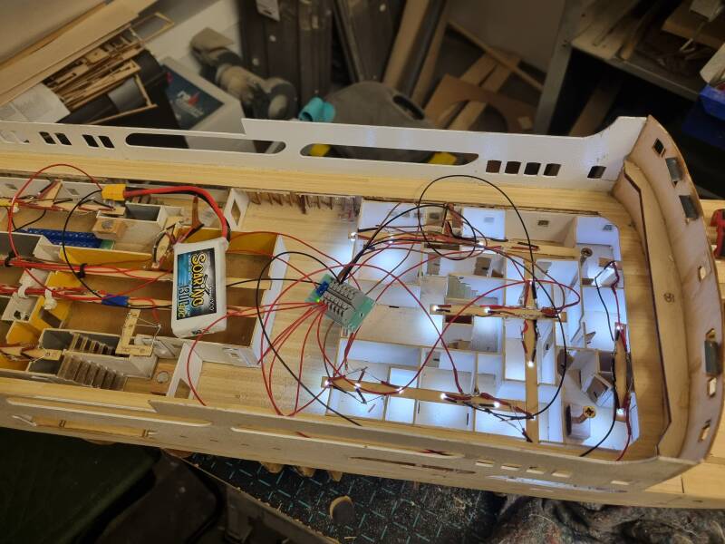 Zum vorderen Mannschaftsdeck (welches Fest eingebaut und nicht herausnehmbar ist) ist eine Stromzuführung durch den Rumpf bereits verlegt.!