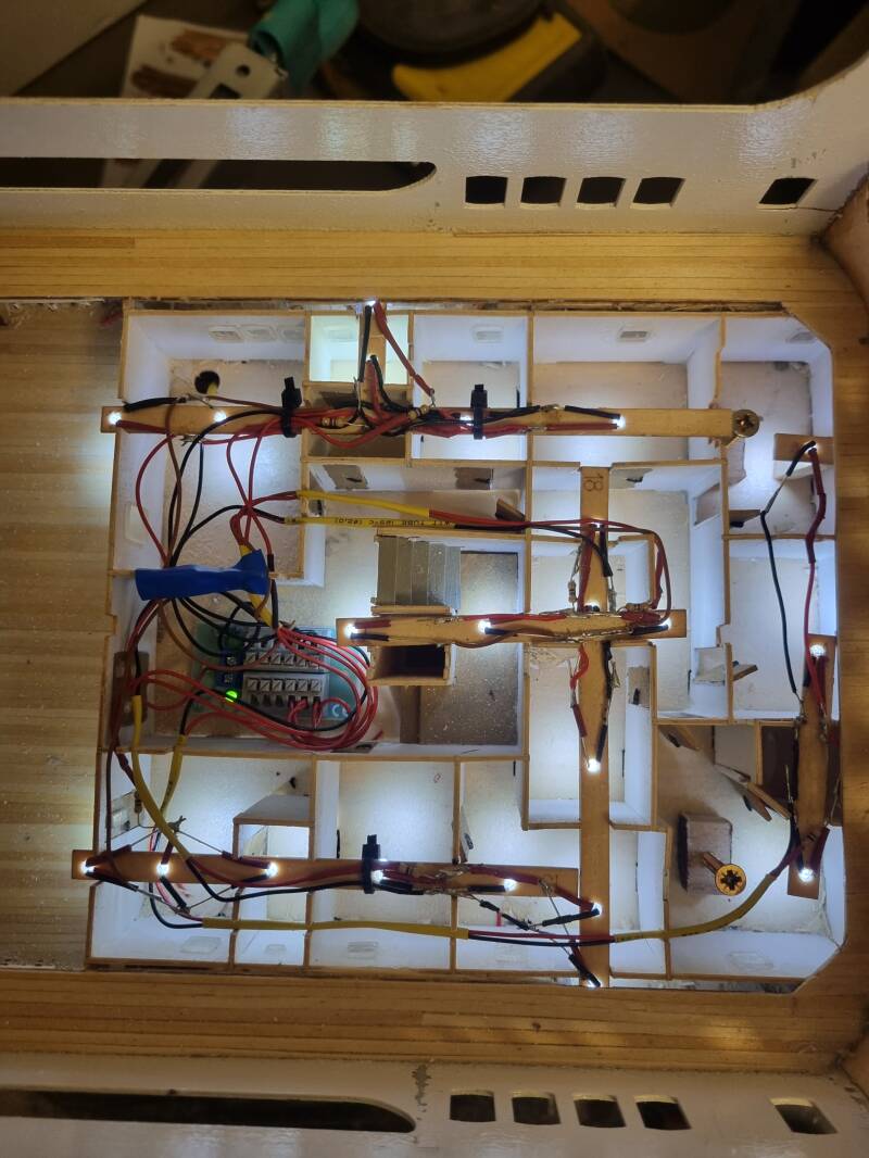 Das untere Deck ist nun komplett an die Stromversorgung angeschlossen und so eingepasst, dass die Kabelstränge nirgendwo mehr anstoßen und das Deck sauber aufliegt. Gleichzeitig wurde die Stromdurchführung für die oberen Decks eingebaut.