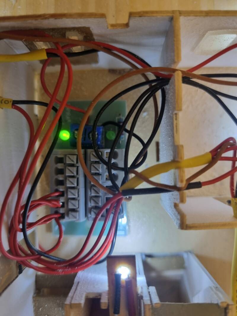 Zum Test wurde das Ganze schon einmal provisorisch angeschlossen und es funktioniert. Neben der sauberen Verlegung der Verdrahtung muss lediglich noch die Verbindung zum Schaltmodul hergestellt werden.