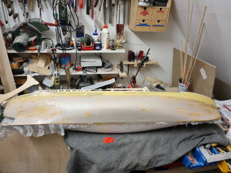 Auch wenn es auf dem Foto nicht so aussieht: Die Oberfläche ist vollkommen glatt verschliffen. Weder am Rumpf noch an den Oberflächen der Schanzkleider befinden sich noch irgendwelche Unebenheiten!
