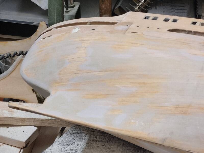 Die fertiggestellte hintere Decksbeplankung wir nun mehrfach mit Porenfüller gestrichen und mit feinem Sandpapier abgeschliffen.