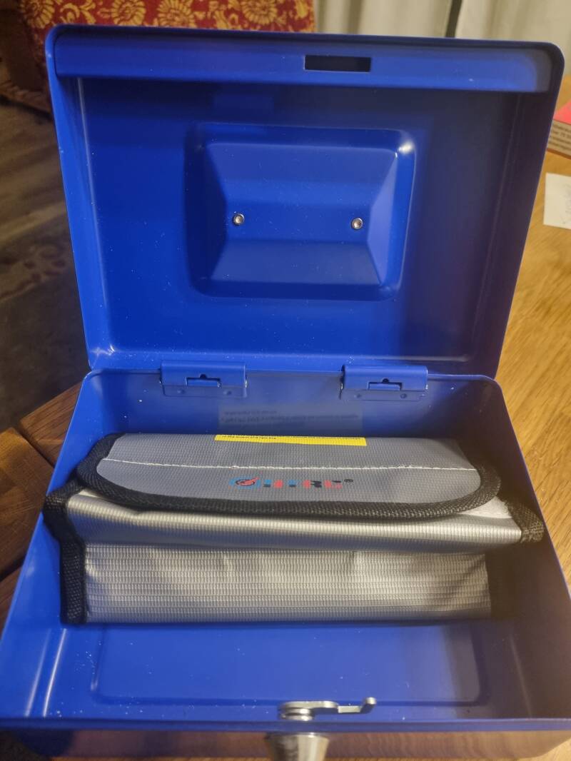 Manche Lipoly-Hersteller liefern ihre Akkus mittlerweile mit solchen "Safety-Bags" aus, was schon mal sehr gut ist. Ich habe mir eine weitere Möglichkeit ausgedacht, meine Lipo-Akkus zu lagern: Ich bewahre sie in einer ausrangierten Geldkassette aus Stahlblech auf. Stahlblech ist (natürlich) nicht entzündbar und ein Akku bekommt darin bei einer evtl. Selbstentzündung nicht genügend Sauerstoff, den ein Feuer nun mal benötigt.