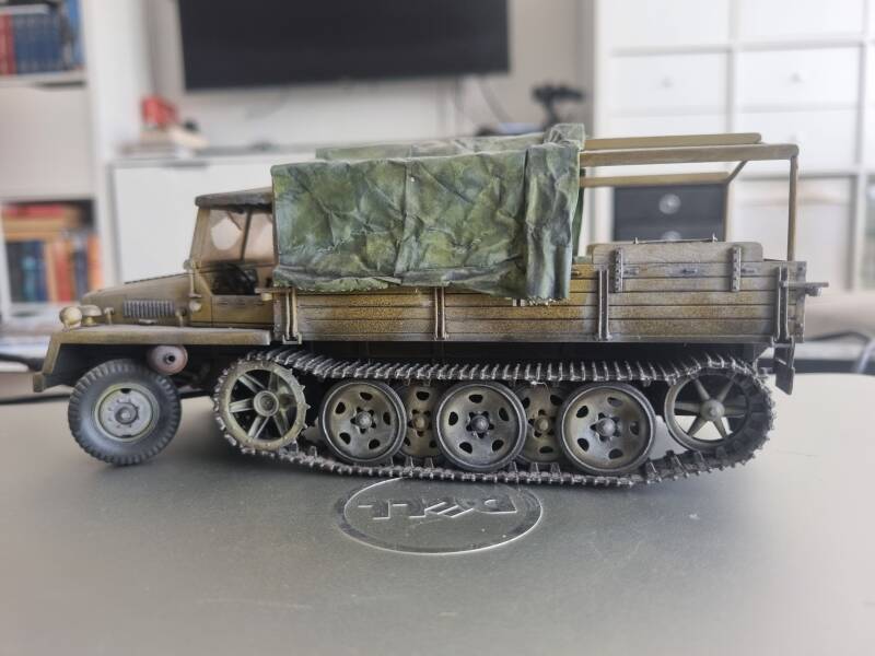 Das gezeigte Fahrzeug wurde nach der Lackierung in Dunkelgelb komplett einem "washing" mit schwarzer Ölfarbe unterzogen. Man beachte, dass sich die schwarze Farbbrühe insbesondere in den Vertiefungen zwischen den Holzbrettern der Pritsche gesammelt hat. Dies wirkt sehr authentisch. Die Plane besteht aus Alufolie und wurde grundiert, in matt-olivgrün lackiert, mit schwarz gewaschen und aufwändig trocken gemalt! Auch an den Laufrollen und am Vorderrad sind die Effekte des Trockenmalens mit weißer Farbe gut erkennbar.